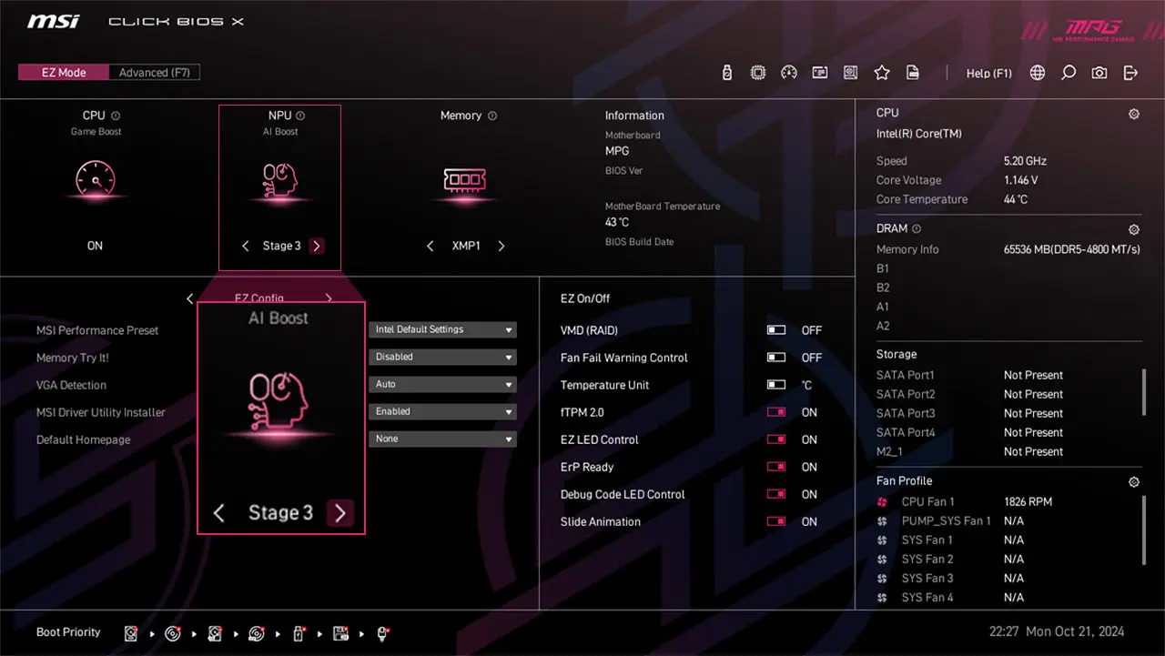 MSI Click BIOS X makes overclocking more accessible for both processors and memory. AI Boost offers three-stage NPU overclocking, tested by MSI OC Lab and capable of delivering up to a 27% performance increase, which significantly enhances AI computing tasks.