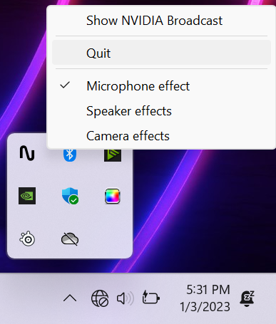 To exit it completely, right-click the NVIDIA Broadcast icon in the taskbar and select "Quit.".